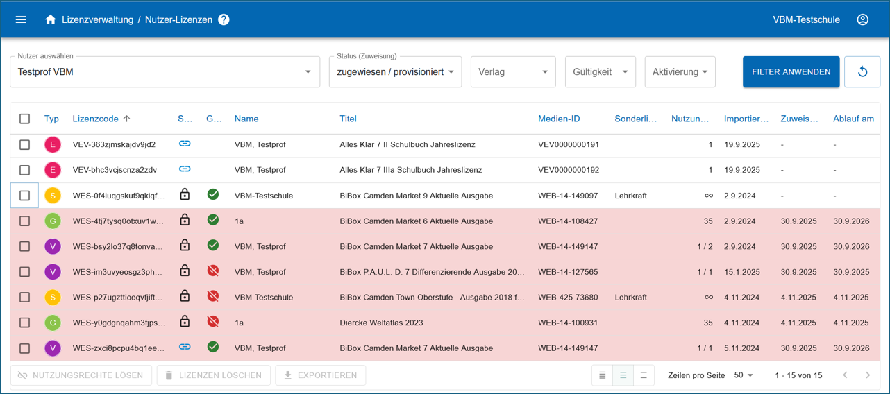 Bitte geben Sie einen Nutzernamen in das Suchfeld ein. Es werden passende Nutzernamen in einer Vorauswahl eingeblendet. Klicken Sie auf den richtigen Nutzernamen. Danach führen Sie die Suche nach Lizenzen aus, indem Sie den Button "Filter anwenden" verwenden.